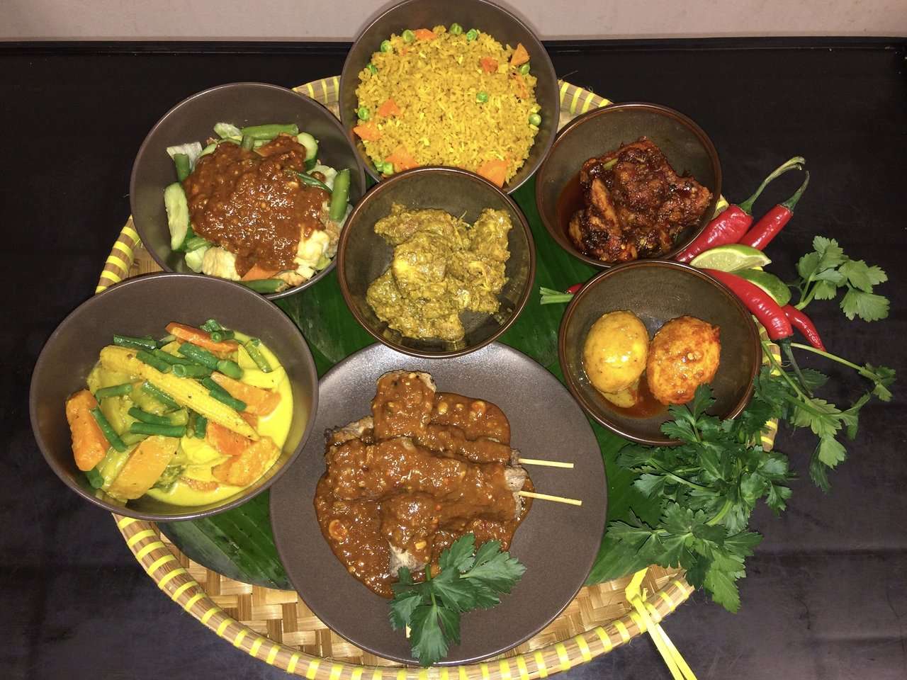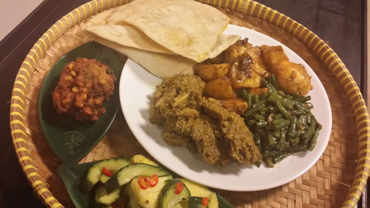 Pannenkoek van erwten met rendang en daging belado, ayam curry, kerrieaardappelen, kerrie ei + zoet/zuur komkommers + mango chuntney en maïskoekje